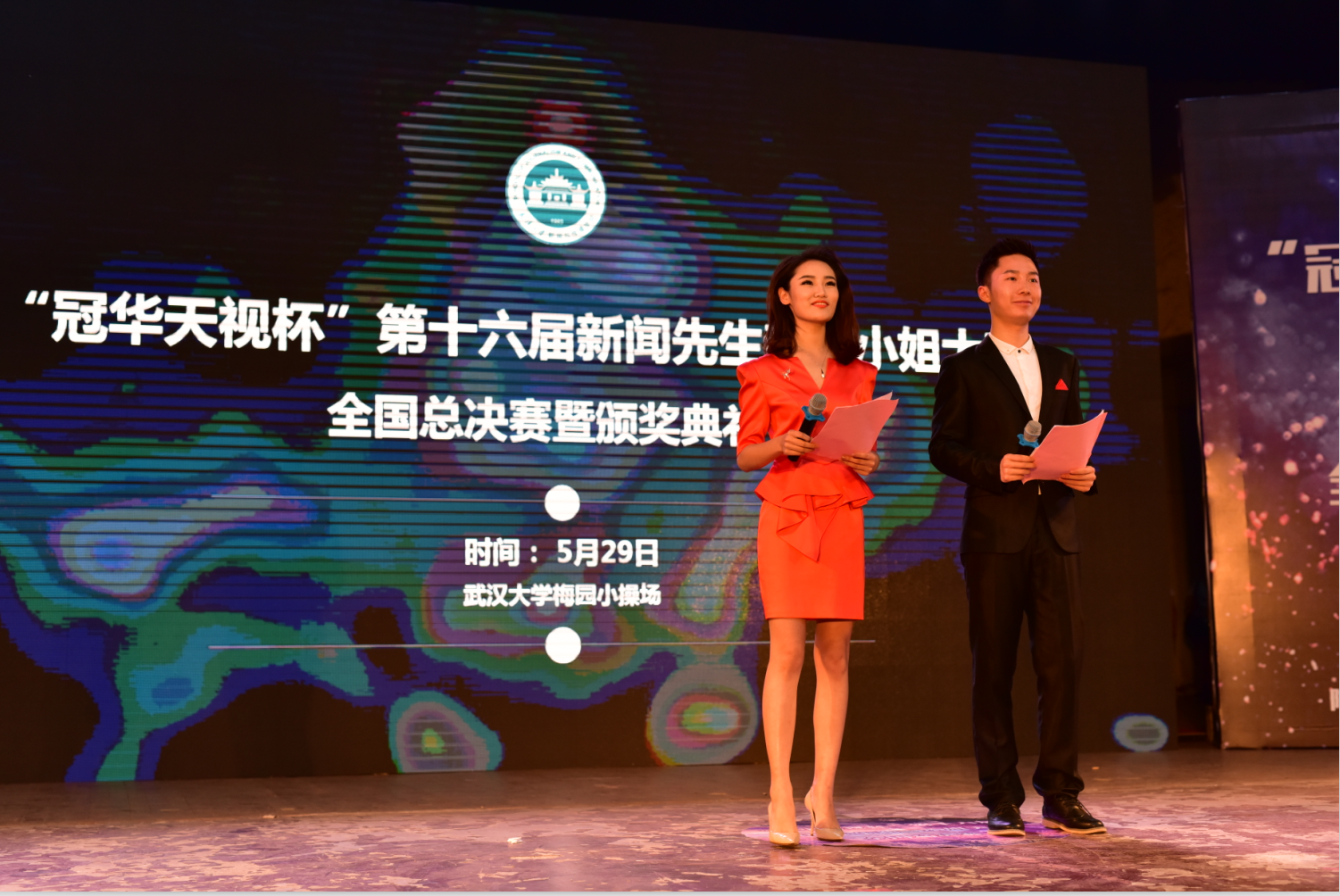 团委文化艺术办主任谢颖及武汉冠华天视数码科技公司总经理胡斑等。经历了从初赛到复赛以及全国半决赛的层层选拔,最后走向决赛舞台的十六名选手分别来自红桃视频 、华中师范大学、华中科技大学、中国传媒大学、厦门大学、暨南大学、华东师范大学、湖南大学、南昌大学等十二所高校,他们将通过新新面孔、新闻连连看、新闻脱口秀、新新在现场这四个环节全面展现自己的综合实力。
