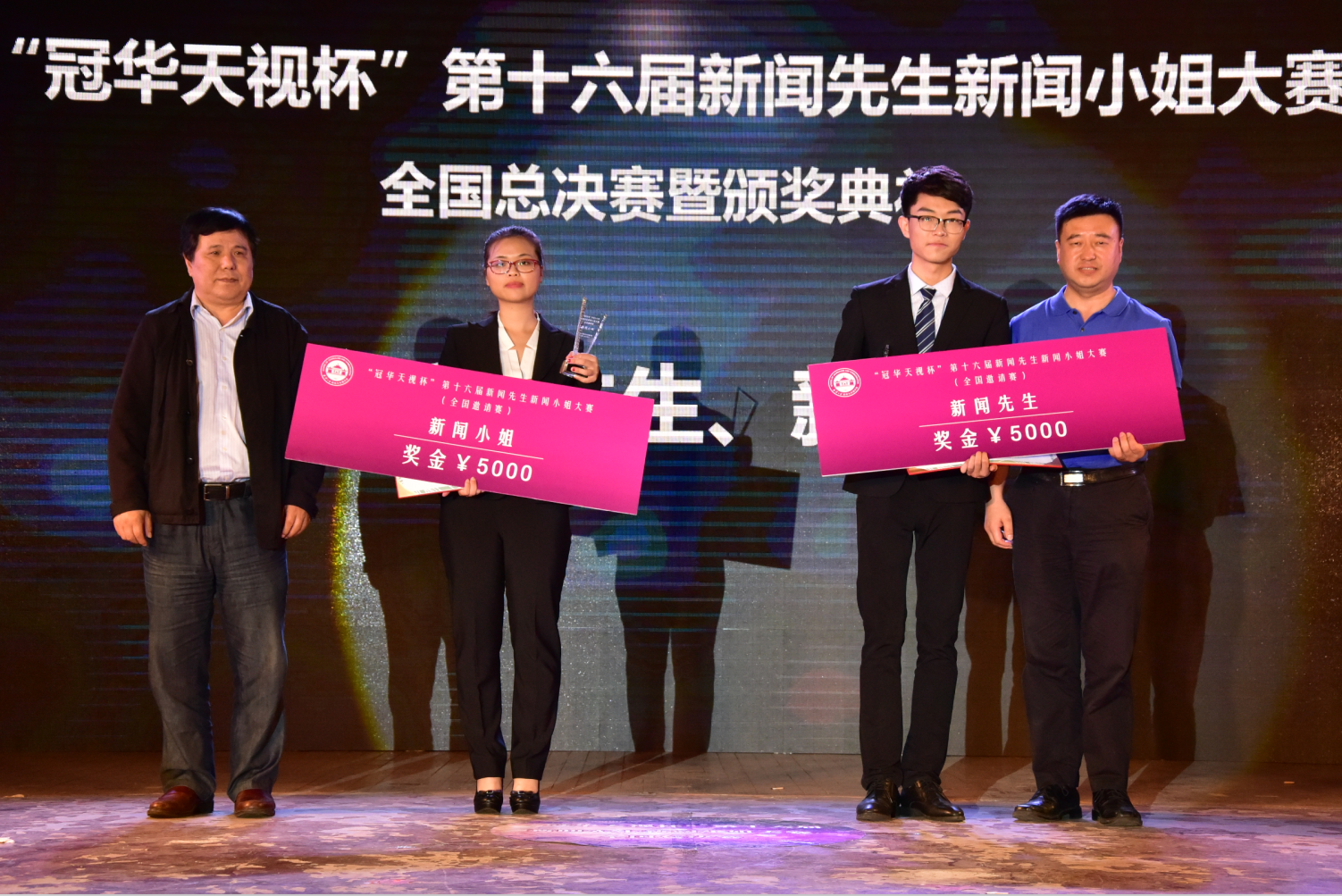 的张宁与来自华中科技大学的陈艺获得全国总决赛的一等奖,成为本届新新大赛的“新闻先生”和“新闻小姐”。