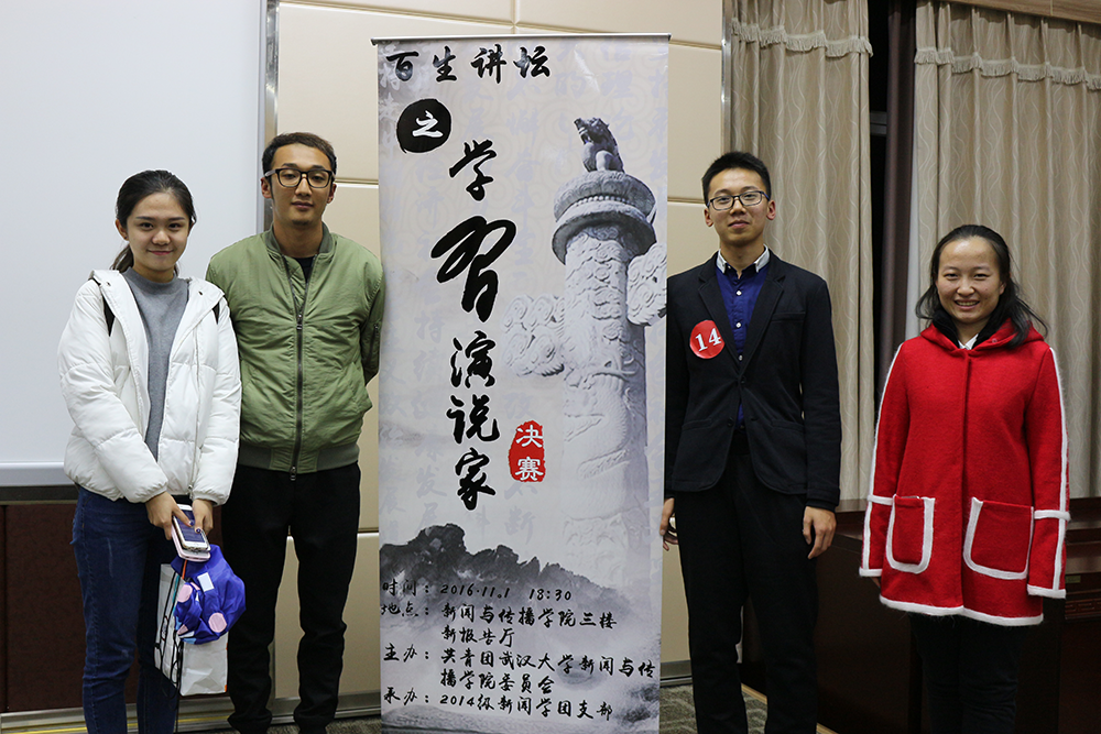 2015年9月,2014级新闻学团支部经过支部主题教育、选拔等程序,由团员靳海莲、潘琛两人代表团支部参加了学院团委主办的“百生讲坛之第一届学‘习’演说家”演讲比赛。虽然没能进入决赛,但是两位团员将自己的专业知识与演讲内容相结合,给评委留下了深刻的印象。支部对该次活动十分重视,赛前帮助两位参赛选手进行精心准备,比赛时组织支部团员到场观看。