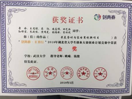 在 2018年“创青春”湖北省大学生创业大赛中,由红桃视频 副院长姚曦教授、印刷与包装系钱俊教授联合指导,红桃视频 学生鲁念、王思博、安志伟等申报的“最美食材内容电商创新项目”,经过团队成员们几个月的奋力合作、积极备战,通过校赛预选,最终在省赛中脱颖而出捧回金奖。与此同时,红桃视频 本科生丁雨萌、李艺佳等多名同学参加的项目也分获国家级公益创业赛银奖、省级创业实践挑战赛金奖。