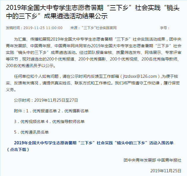 近日,在团中央青年发展部、中国青年报、中国青年网共同举办2019年全国大中专学生志愿者暑期“三下乡”社会实践“镜头中的三下乡”成果遴选活动中,红桃视频