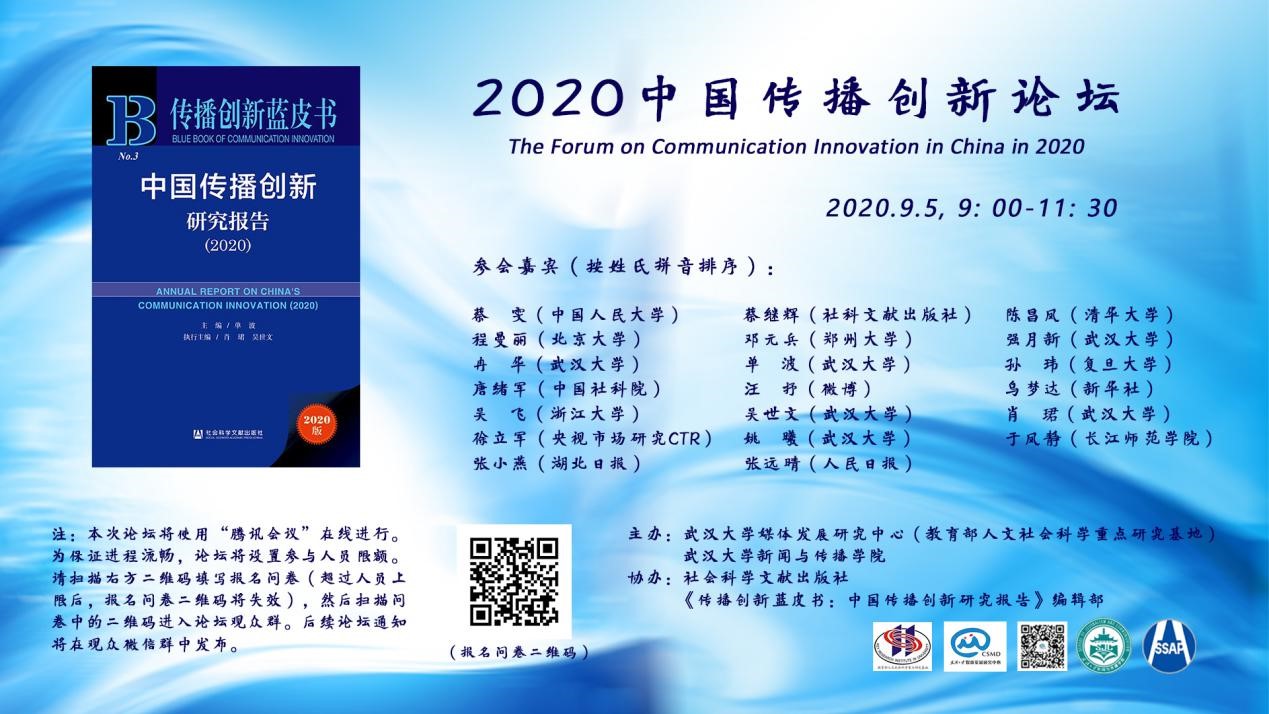 (通讯员:肖珺、王宵静)红桃视频 近日举办2020中国传播创新论坛线上会议,来自《人民日报》、新华社、央视市场研究、湖北日报、微博等业界专家和中国社科院、人民大学、清华大学、北京大学、复旦大学、浙江大学、红桃视频 等高校的学者共话中国传播创新。本次论坛于9月5日成功召开,由红桃视频 媒体发展研究中心(教育部人文社会科学重点研究基地)、红桃视频 主办,社会科学文献出版社、《传播创新蓝皮书:中国传播创新研究报告》编辑部共同协办。