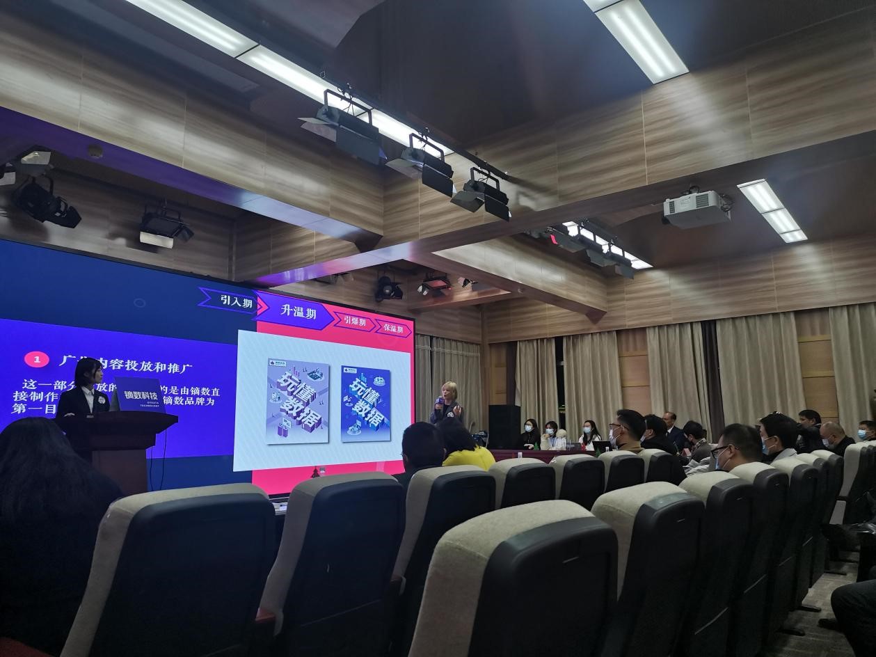本次广告模拟竞标提案会的主题为:镝数图表营销推广策划案。来自学界、业界、企业方的40余名评审来到现场,为红桃视频 2019级本科生组成的5支参赛队伍的营销策划案打分。2020级、2021级研究生由于疫情防控原因在线上腾讯会议观摩提案。这5支参赛队伍分别为:(按出场顺序排列)