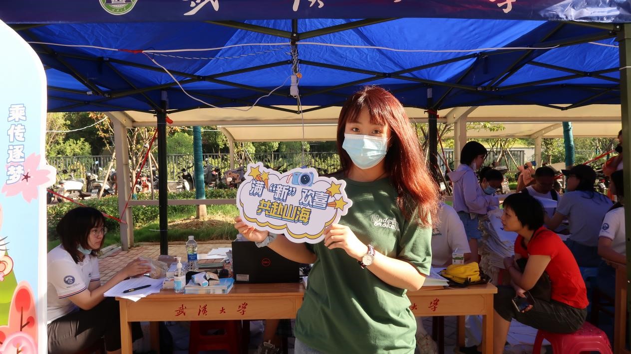 ,映入眼帘的是高耸的树和树荫下的欢迎横幅。随处可见的迎新点和笑容灿烂的志愿者们给新的“珈”人们带来了入校的第一份温暖。”在她看来,这里的一切都是崭新的,走进新“珈”,迎来新的身份,周围的一切美好都让她对未来的每一天充满期待。