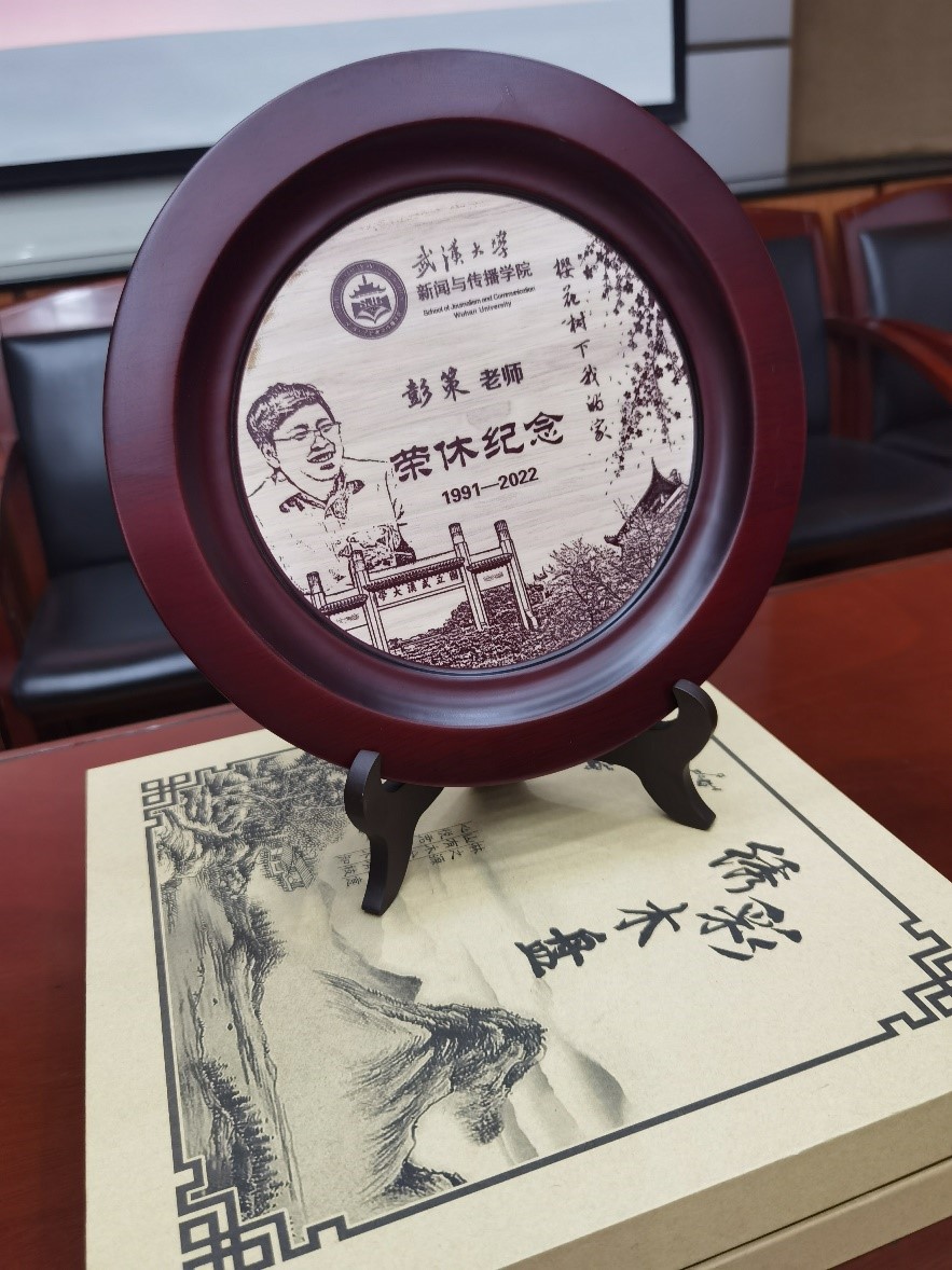 2022年学院共有彭策老师、朱臻老师二位教职工荣休。朱老师因故无法参会,院长强月新教授为参加荣休仪式的彭策老师颁发了学院特制的荣休纪念牌。