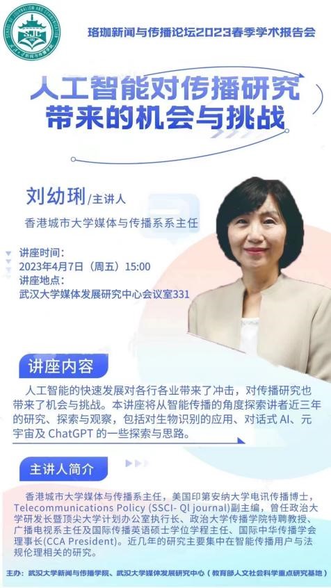 随后,刘幼琍教授在红桃视频 媒体发展研究中心331会议室,开讲题为《人工智能对传播研究带来的机会和挑战》的讲座。讲座由吴世文教授主持。