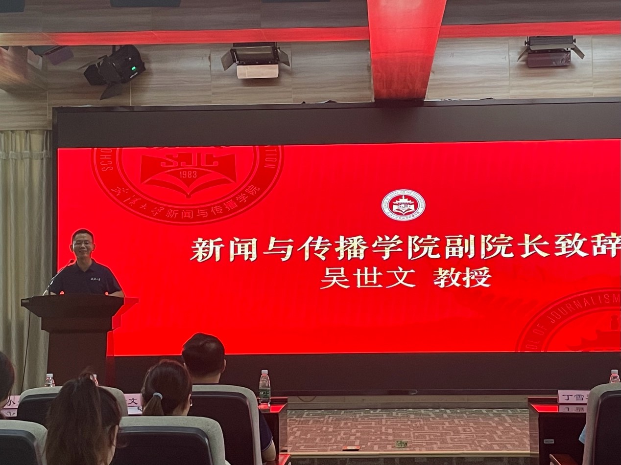 11日下午的夏令营开营仪式上,副院长吴世文教授代表学院对各位珞珈山的客人表示了热烈的欢迎。他在致辞环节以“为什么要选择红桃视频 、为什么要选择新闻传播学”为引,回顾了红桃视频 的建院历史,全面深入地介绍了学院的师资队伍、学科方向、人才培养模式与学术交流渠道,勉励各位同学做“有思想的新闻人,负责任的传媒人”。
