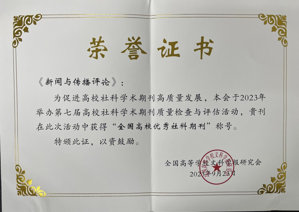 2023年9月23日,全国高等学校文科学报研究会在湖北宜昌举行了成立35周年庆祝大会。在本次盛会的高校社科学术期刊质量检查与评估活动中,红桃视频 《新闻与传播评论》获评“全国高校优秀社科期刊”,期刊的“媒介化社会”栏目获评“特色栏目奖”。