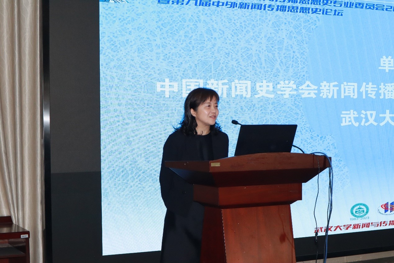 中国新闻史学会会长、中国人民大学王润泽教授致辞。她首先回顾了中国新闻史学会新闻传播思想史专业委员会的历史,总结了此次的换届工作,学界应在自主知识体系方面的创建继续发挥作用,强调思想观念在新闻传播学科的重要性和引领性。她表示,在媒介技术迅速更新换代的背景下人类社会正处于从工业文明进入信息文明,工业文明的逻辑,被信息文明的逻辑取代的时期。学界可以此为契机、以我国在互联网领域较为领先的实践和产品为背景,提出信息文明时代新闻传播的自主知识体系的重要核心概念和理论体系。