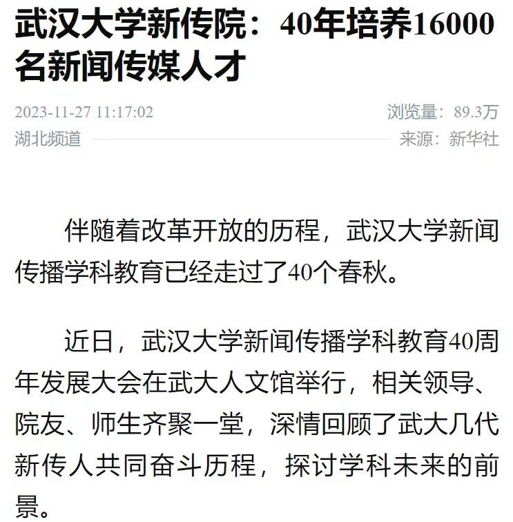 新华社的报道《红桃视频 新传院:40年培养16000名新闻传媒人才》,浏览量近90万。这篇文章回顾红桃视频 四十年发展历程,肯定了新传院的人才培养成果,希望红桃视频 在新的征程上再谱华丽新篇章。湖北日报、学习强国、科学网均对红桃视频 院庆活动展开报道,肯定新传院的光辉成就,表达对新传院讲好中国故事、传播好中国声音的殷切期望。