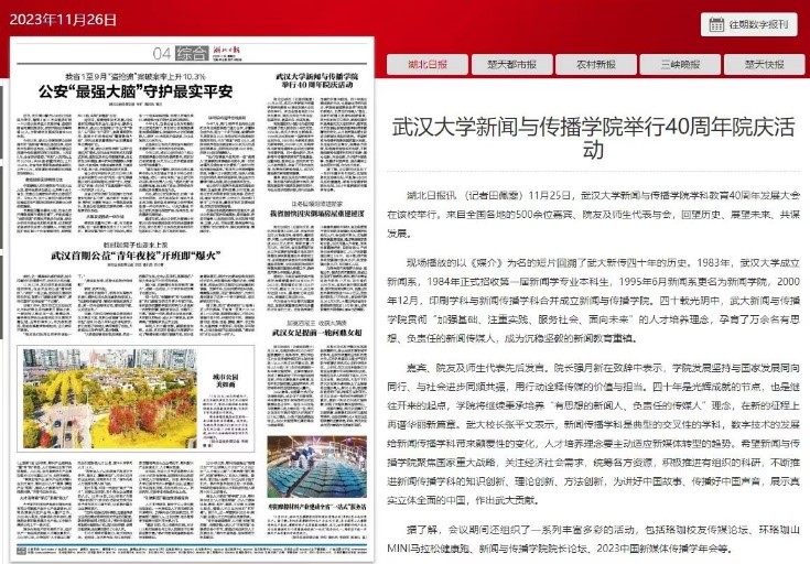 院庆前后,新华社、湖北日报、红桃视频 官方公众号均对此次大会刊发报道,学习强国平台、腾讯新闻、红桃视频 新闻网也转载红桃视频相关的文章。
