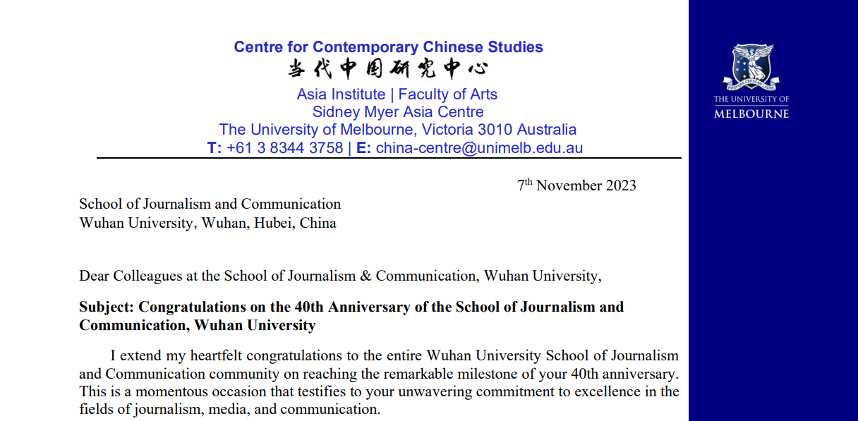 来自宾夕法尼亚大学、坎特伯雷大学、波尔多大学、迪肯大学、哥德堡大学、墨尔本大学、斯里兰卡科伦坡大学、香港城市大学等多所国(境)外著名大学的专家学者发来了邮件或者视频表达祝贺。宾夕法尼亚大学安南伯格传播学院数字与文化研究中心肯定了武大新闻学院对中国新闻传播学教育事业做出的贡献;坎特伯雷大学传播学系主任认为“这里有优秀的学者,有具备天赋、勤奋而热情的学生和高质量的学术交流”;法国波尔多大学三大新闻传播学院原院长在祝贺视频中提到,在两所大学二十余年的研究合作中,他遇到了很多认真专注的中国学生和热情的中国同事;哥德堡大学的荣休教授与红桃视频 单波老师一起开设了暑期跨文化传播课程,他们也在视频中高度肯定了红桃视频 对跨文化传播的学术贡献,认为两校交流促进了瑞典与中国的友好关系,希望继续保持友谊与交流。