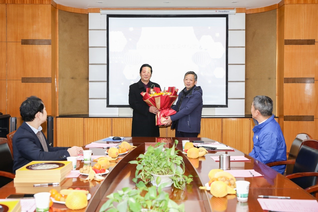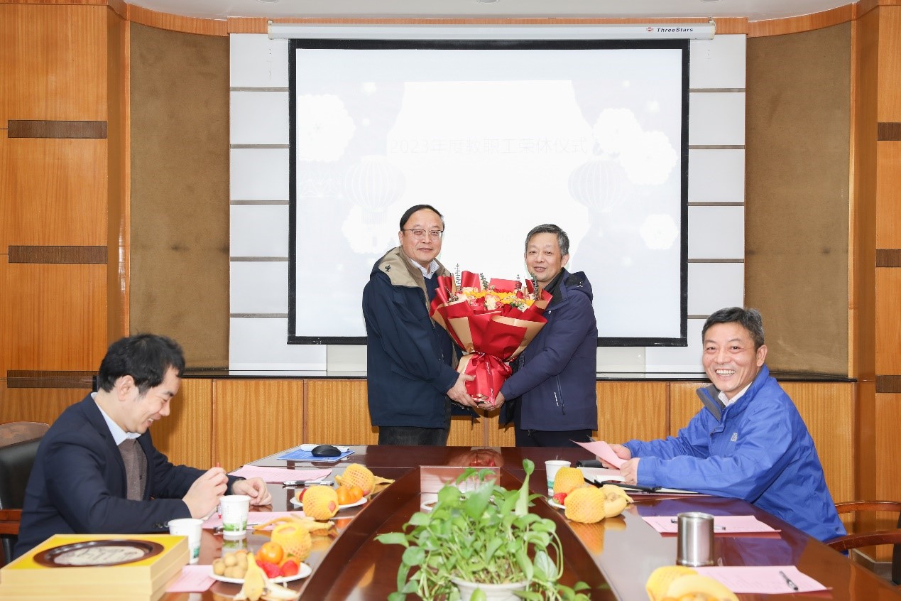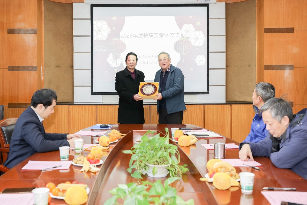 2023年,学院的周光明教授和学院原党委书记李玉龙荣休。学院院长强月新教授首先为这两位荣休的教职工颁发学院特制的荣休纪念盘。