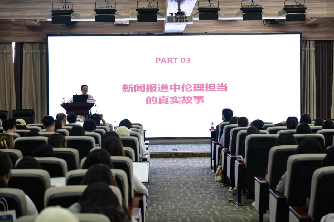 除了理论的介绍,此次讲座中,江老师还结合新闻实践,重点给同学们分享了新闻报道中有关伦理担当的六个真实故事。
