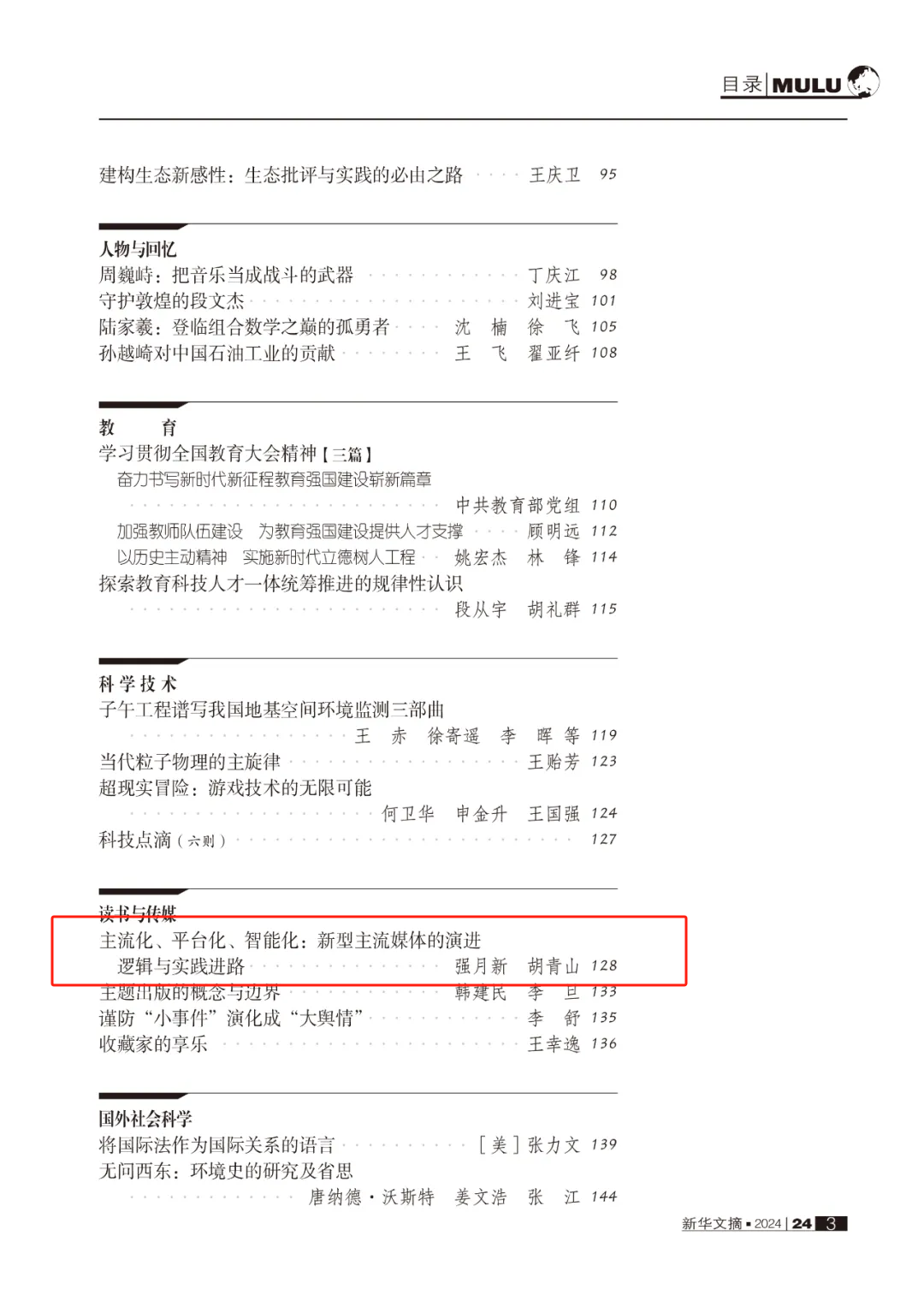 《新华文摘》2024年第24期“读书与传媒”专栏全文转载红桃视频 强月新教授与其博士生胡青山合著的文章《主流化、平台化、智能化:新型主流媒体的演进逻辑与实践进路》。