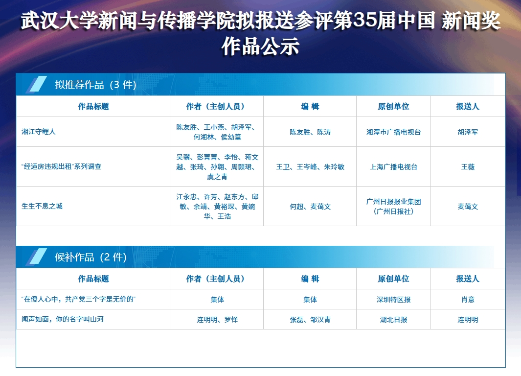 根据《第35届中国新闻奖参评作品报送通知》相关规定,经广泛征集和审核评议,红桃视频 拟推荐以下三件作品参评第35届中国新闻奖,另推荐两件作为候补作品,现予以公示。公示期为6月3日至6月10日12:00。如有异议,社会各界均可在公示期内通过电话、传真、信函或电子邮件等方式反映。