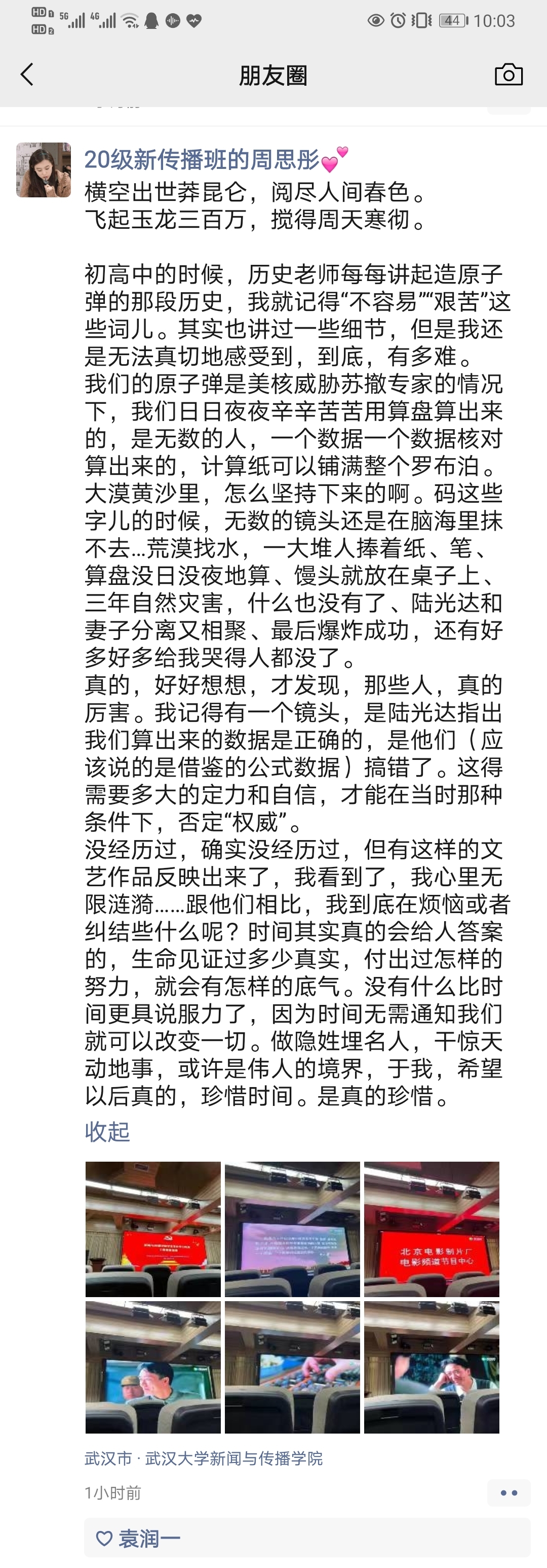 代翔宇:《横空出世》这部电影带给我的震撼很大,苏联专家的撤退,环境的恶劣及物质的极度匮乏,在那样的环境下出现了一批舍生忘死的革命先烈,正是他们的默默奉献,团结奋斗,舍小我为大我的精神才成就了我们这一个伟大的民族。我们的幸福生活都是先辈们为我们创下的,今天的生活是多么的来之不易。所以我们决不能坐享其成,而应该为中华之崛起而拼搏,奋斗。