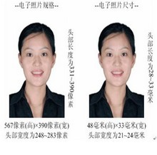 2、图像规格:567像素(高)× 390像素(宽),头部宽度为248~283像素,头部长度为331~390像素,分辨率300dpi,图像文件大小在20~200 kB,JPG格式。图像尺寸为48毫米(高)× 33毫米(宽),头部长度为28~33毫米,头部宽度为21~24毫米。