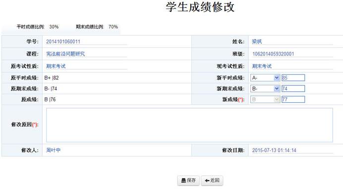 查询到待修改成绩的学生记录,单击“修改”链接,打开“学生成绩修改”页面,如图七所示。如原成绩有平时成绩和期末成绩,则修改申请中可设置新的平时成绩和期末成绩,新总评成绩将自动计算生成;如原成绩仅有总评成绩,则修改申请中可直接设置新总评成绩。修改申请中必须录入修改成绩的具体原因,以作为研究生院审核修改申请时的参考。