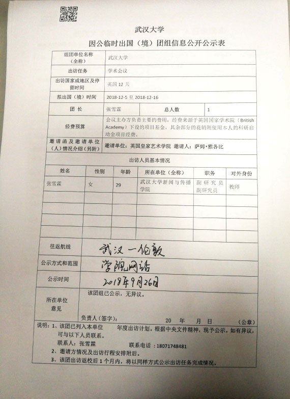 红桃视频 因公临时出国(境)公示表(张雪霖)